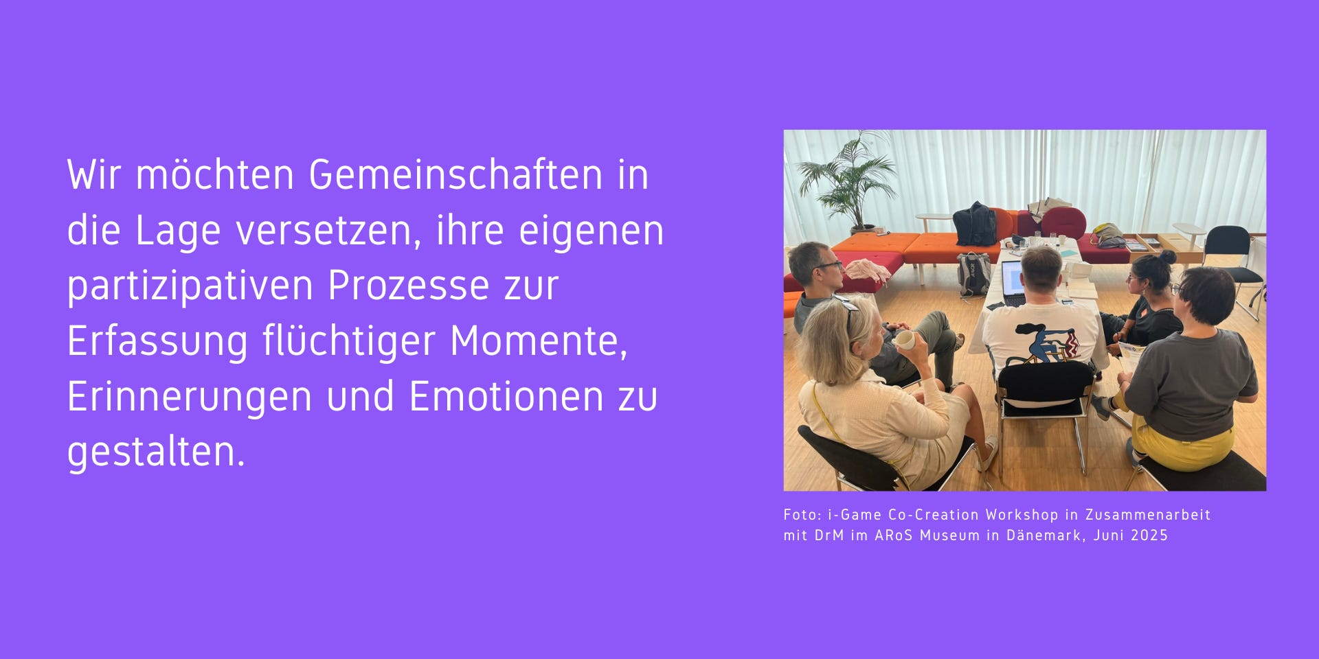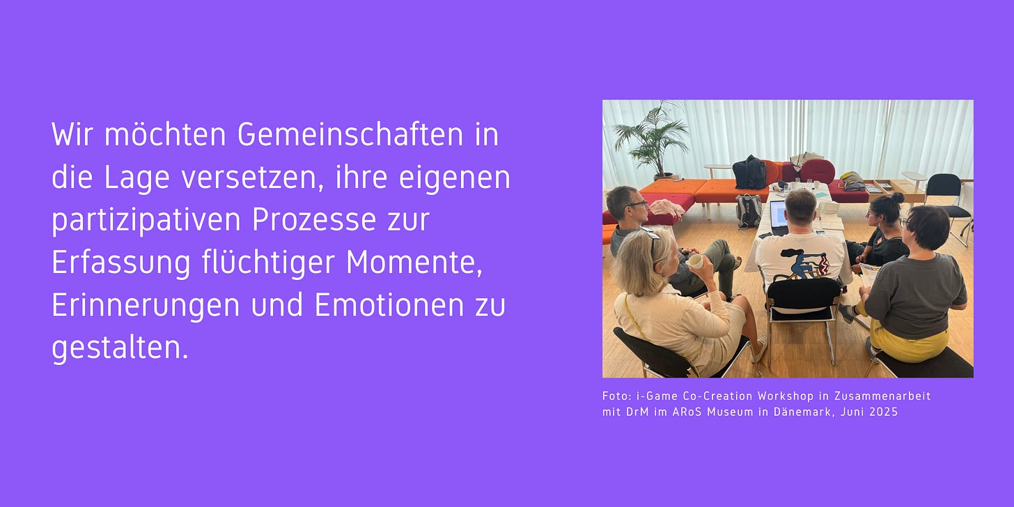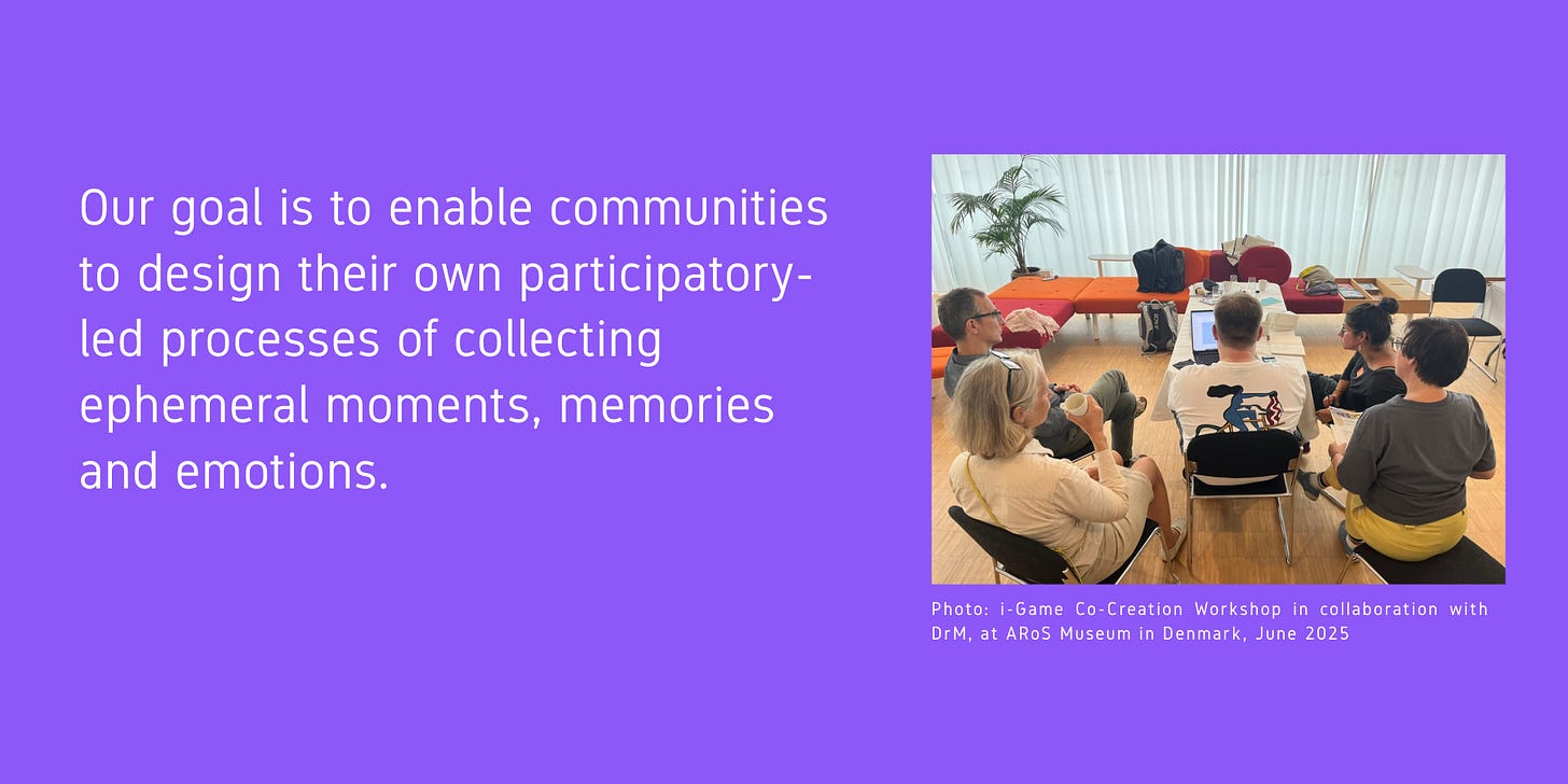 Das oben genannte Zitat steht im Einklang mit den Zielen, für die wir uns einsetzen: Wir möchten Gemeinschaften in die Lage versetzen, ihre eigenen partizipativen Prozesse zur Erfassung flüchtiger Momente, Erinnerungen und Emotionen zu gestalten – was unerlässlich ist, um einander besser zu verstehen und den gemeinsamen Aufbau lokaler kreativer Ökosysteme von unten nach oben zu planen.
